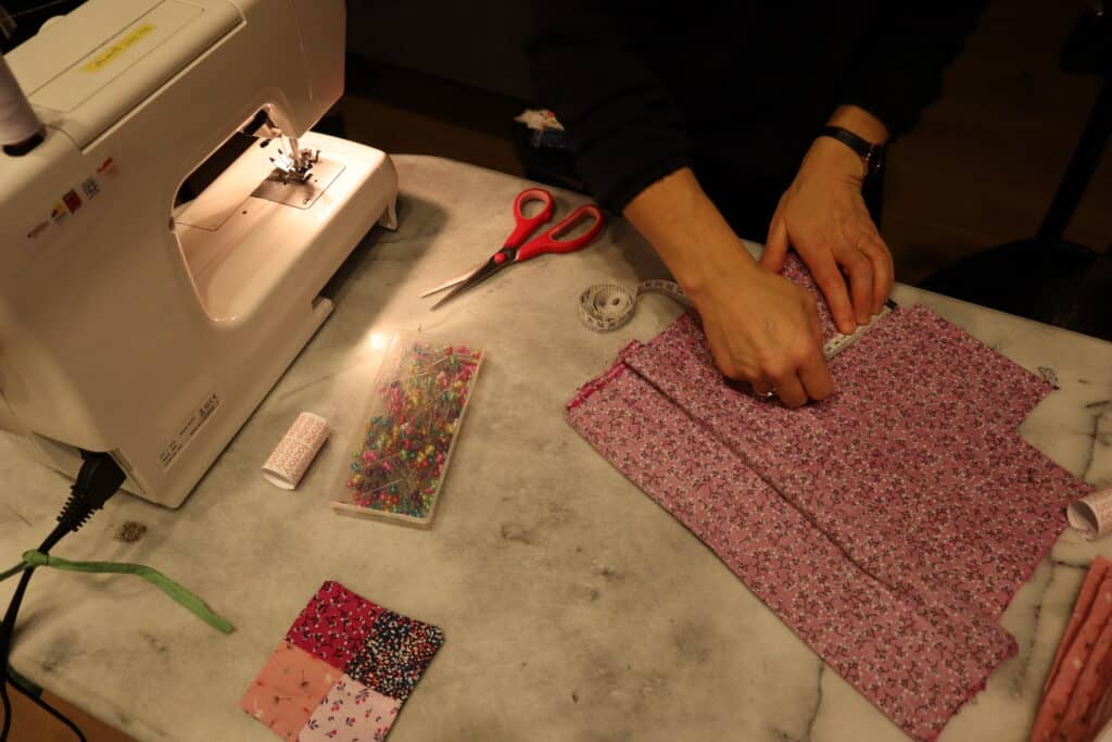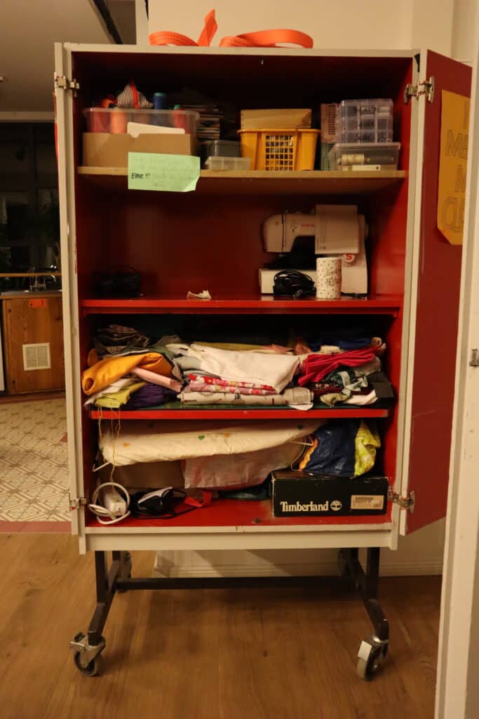 Ein weiteres Nähprojekt, das von den reparierten Nähmaschinen profitiert ist „Nähen am Abend“, jeweils montags von 18:30 bis 20:30 Uhr. Auch dort treffen sich seit mehreren Jahren Näher*innen mit mehr oder weniger Erfahrung zum gemeinsamen Nähen und Austausch in immer unterschiedlichen Gruppenkonstellationen. Die Teilnehmenden können für ihre Taschen, Kleider, Untersetzer und andere Projekte entweder ihren eigenen Stoff mitbringen oder einige Reste verwenden, die vor Ort in der Nachbarschaftsetage zur Verfügung stehen, wie auch weitere Nähmaterialien und ein Bügelbrett.