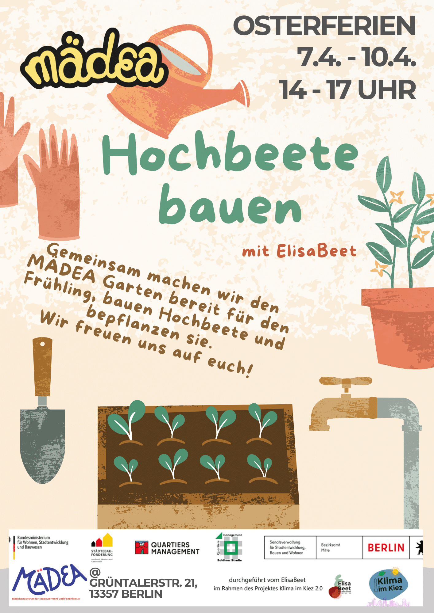 Im Rahmen des vom Projektsfonds des QM Soldiner Kiez geförderten Projekts Klima im Kiez 2.0 leitet das Team vom ElisaBeet Garten einen Bauworkshop an. Wir bauen an vier Nachmittagen ein Hochbeet im Hof von Mädea. Wir sägen Holz, bohren und befüllen das Beet. Wir pflanzen Blumen und Jungpflanzen.